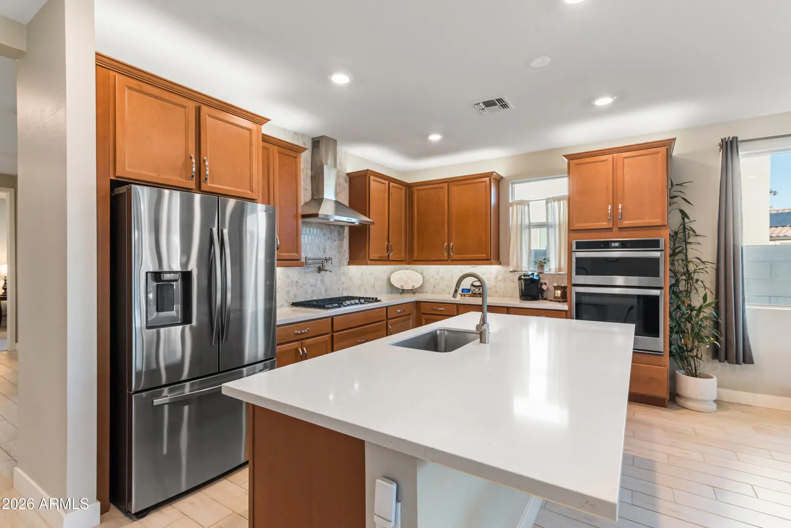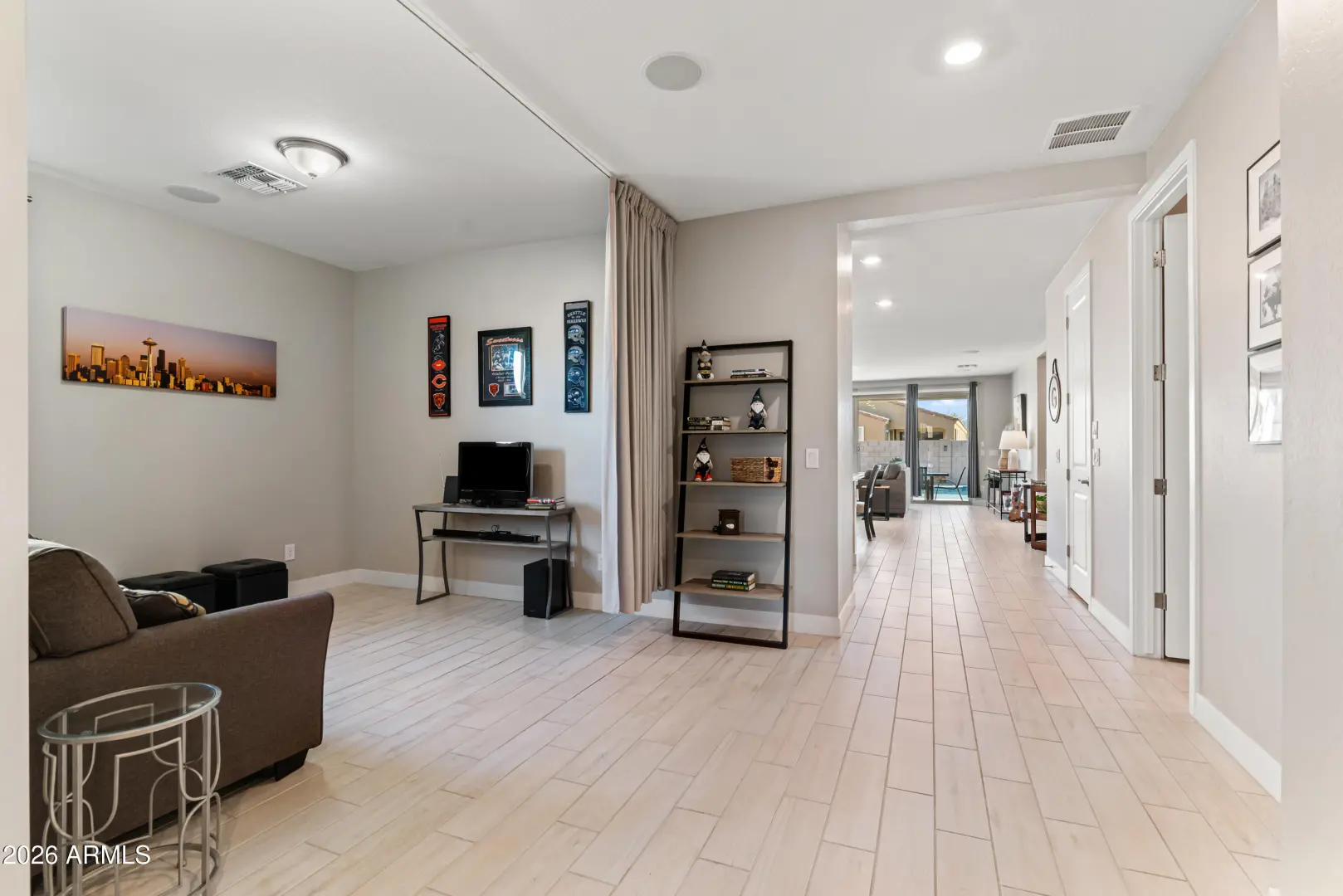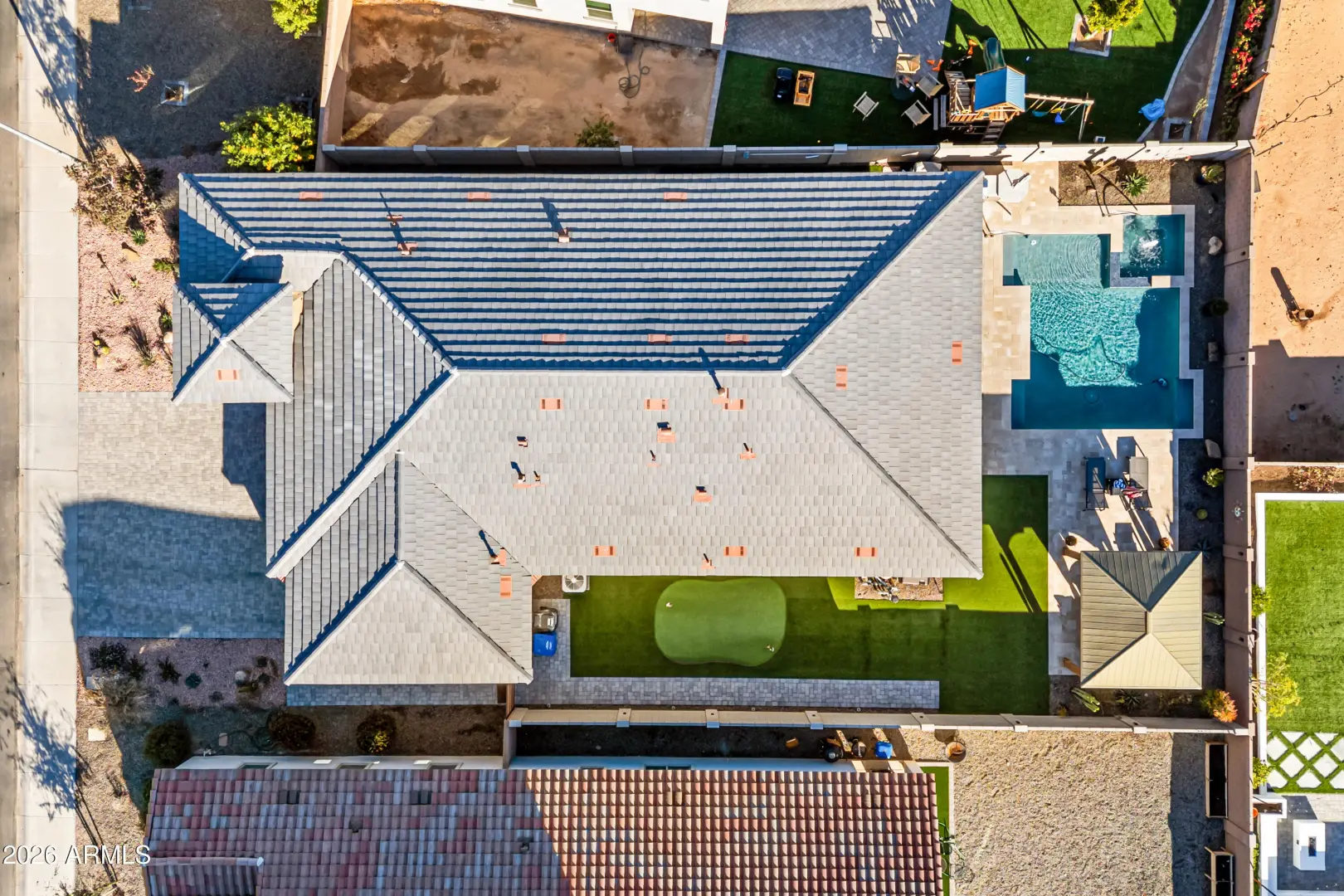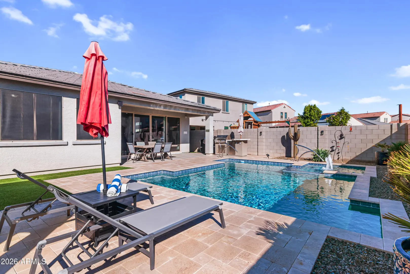 Welcome to a beautifully upgraded home built in 2021 designed for both everyday comfort and standout entertaining indoors and out. Step into a private backyard oasis featuring a heated 5-foot-deep swimming pool and hot tub, complete with wireless color-changing lighting for year-round enjoyment, day or night. The outdoor space is finished with a low-maintenance putting green and artificial turf, creating the perfect balance of fun, function, and curb appeal. A front yard sprinkler system keeps the landscaping looking pristine, while a custom interior/exterior surround sound system sets the mood for relaxing evenings or lively gatherings. Inside, the home is loaded with thoughtful custom additions. The kitchen shines with over- and under-cabinet lighting, quiet-close hinges and... (cont.)