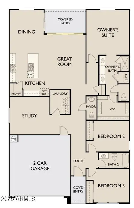 Discover this brand-new 1,949 sq. ft. home in the picturesque Wales Ranch community, featuring 3 bedrooms, 2.5 bathrooms, and a versatile den. The thoughtfully designed layout includes a cozy dining nook and den, perfect for flexible living or work-from-home needs. The home boasts the gorgeous Milan Collection with grey cabinetry, quartz countertops, a stylish backsplash, and wood-style ceramic tile flooring that flows seamlessly throughout. A 4-panel sliding glass door leads to a covered patio and spacious private backyard, ideal for outdoor relaxation. The primary suite offers a peaceful retreat with double sinks, an enlarged shower, an extra linen closet, a private water closet, and a walk-in closet. A conveniently located half bath provides privacy for guests, while added