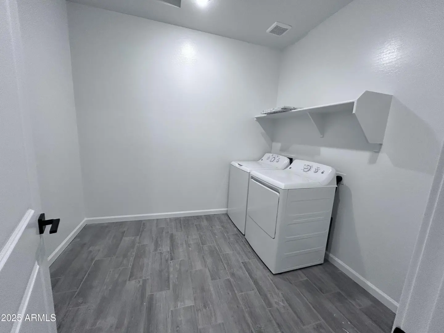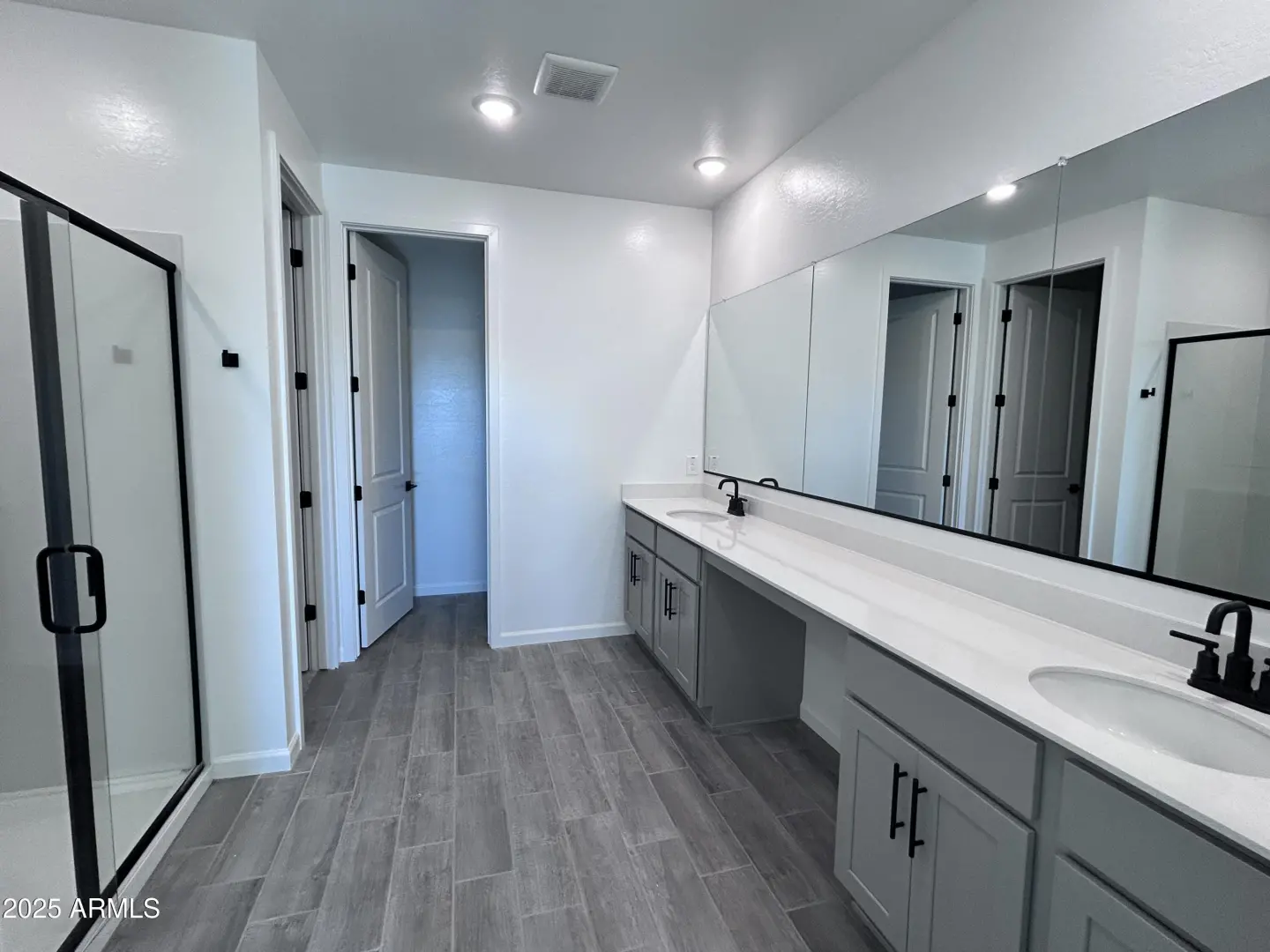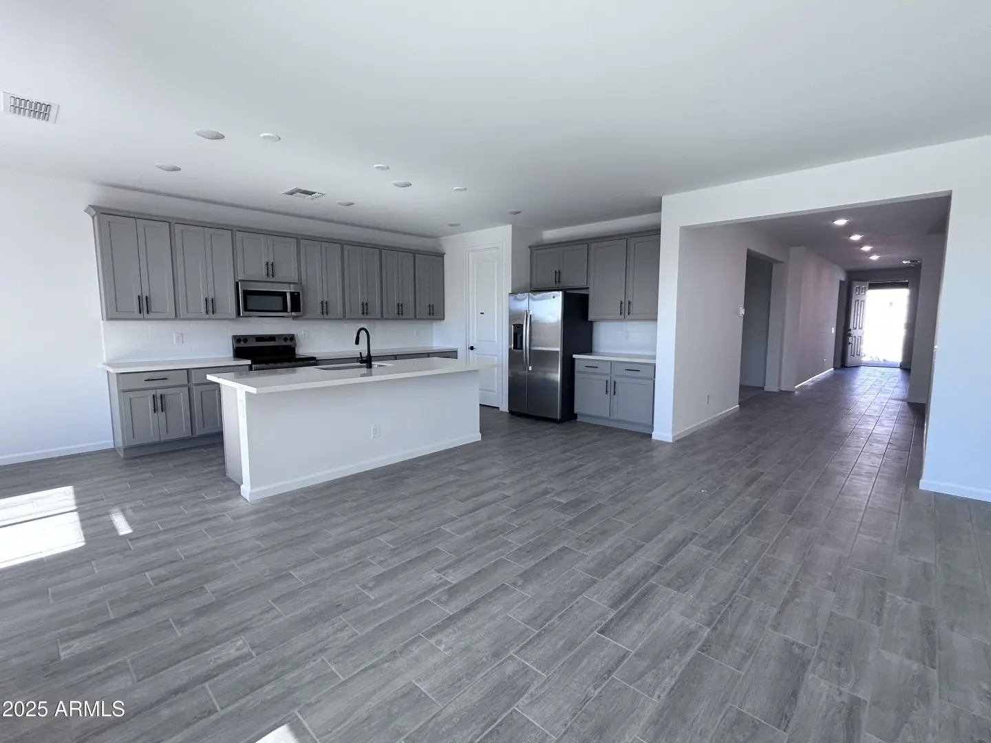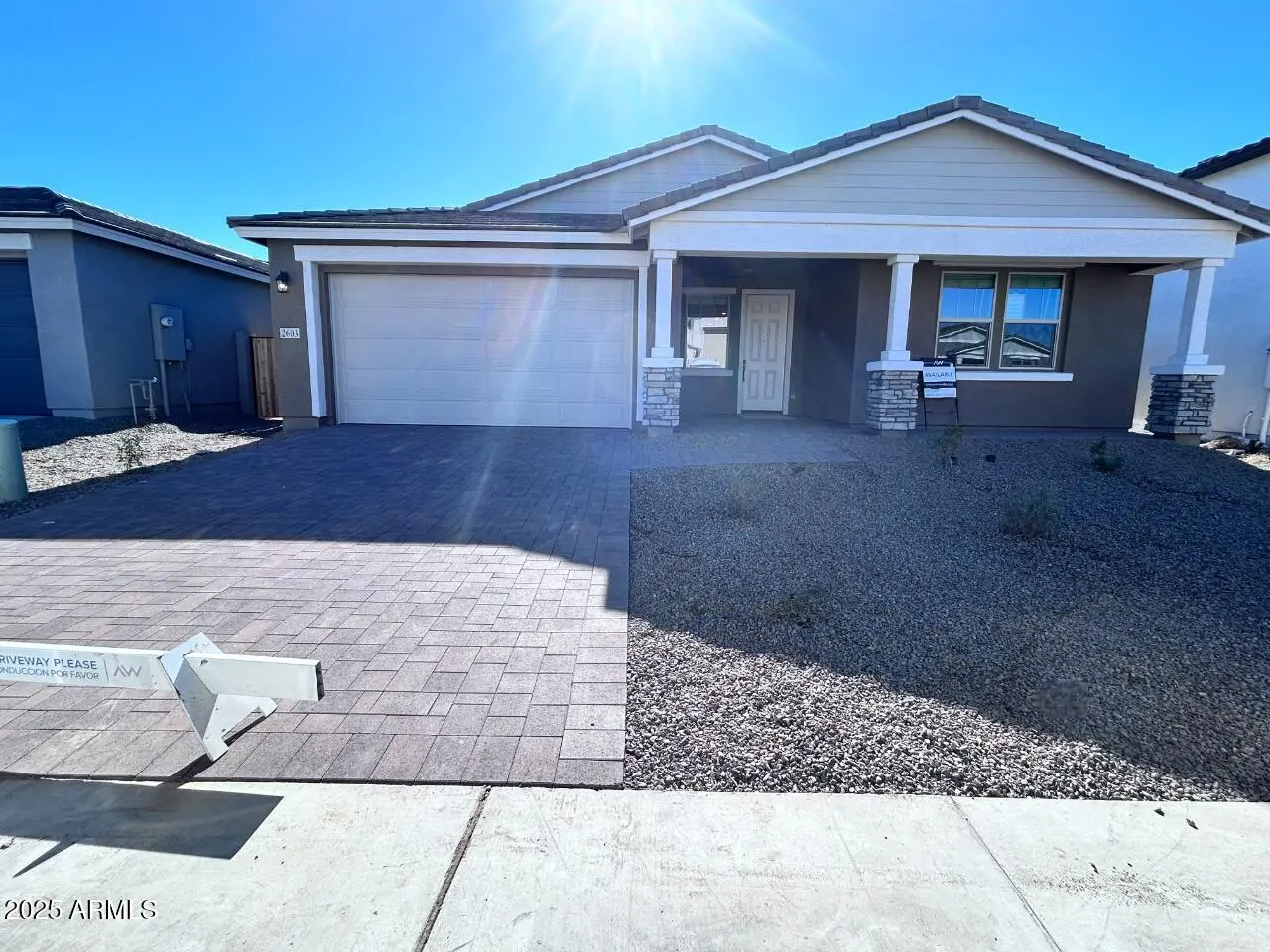 Located in the heart of San Tan Valley, this beautifully designed 2,507-square-foot Topaz home features three bedrooms, two and a half bathrooms, a flexible den, and a spacious three-car tandem garage. Upon entry, you're welcomed by a wide hallway and an inviting foyer with a convenient coat closet. The open-concept layout flows effortlessly into the main living area, where 8-foot interior doors and a stunning 4-panel sliding glass door create a bright, airy space that opens to a private backyard retreat—ideal for relaxing or entertaining. At the heart of the home, the kitchen stands out with elegant quartz countertops, modern gray cabinetry, a stylish tile backsplash, and stainless steel appliances. It's a space designed for both functionality and style. The primary suite