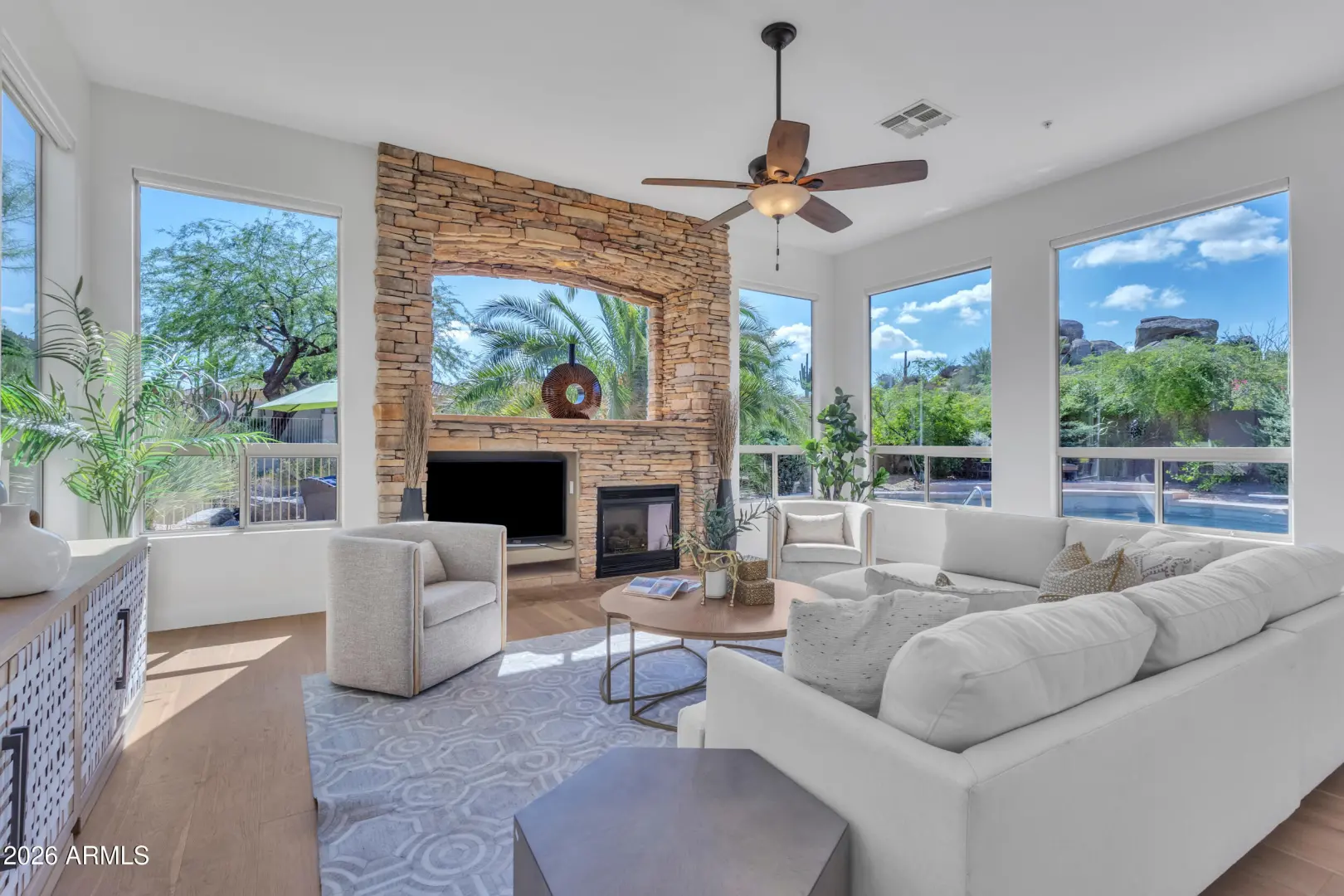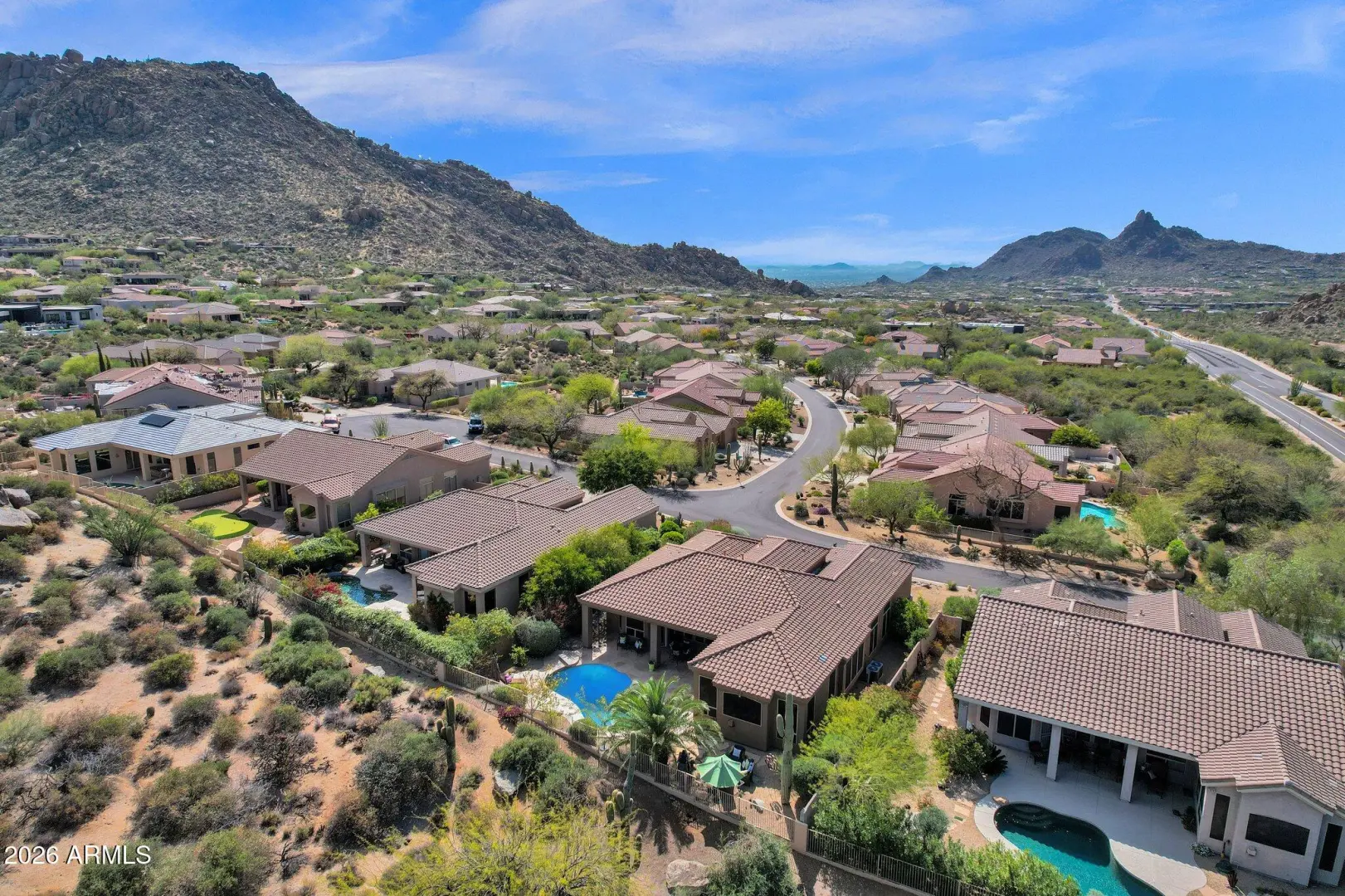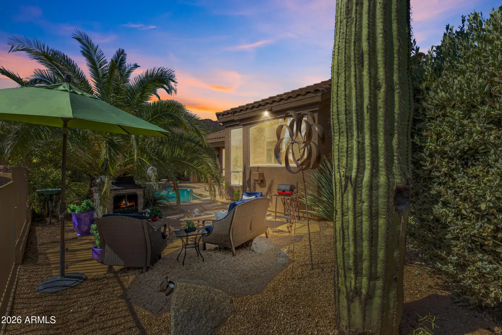 Single-level split floorplan has no steps in or out, 3 full baths, and 3 car garage. Situated on a large lot backing to wash with Boulder Mountain VIEWS and Diving Pool. Brand new wide-plank wood flooring throughout and new carpet in secondary bedrooms. Freshly painted interior and new LED recessed lighting. Office has room for a closet for 4th bedroom. Fully inspected and all minor items have been professionally repaired or replaced incl. pool drained, new lighting, drain cover, aerator and fresh new water. Plus a LOW HOA and access to Troon and Pinnacle Peak hiking. COME SEE!
