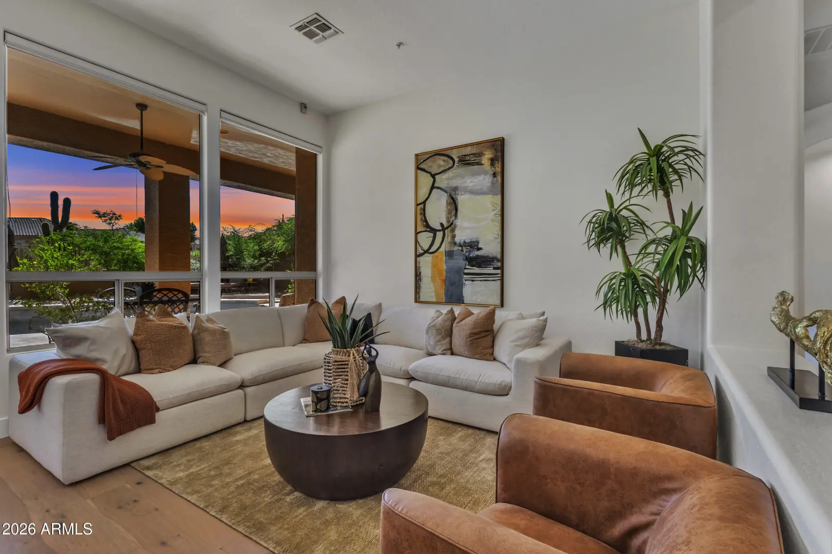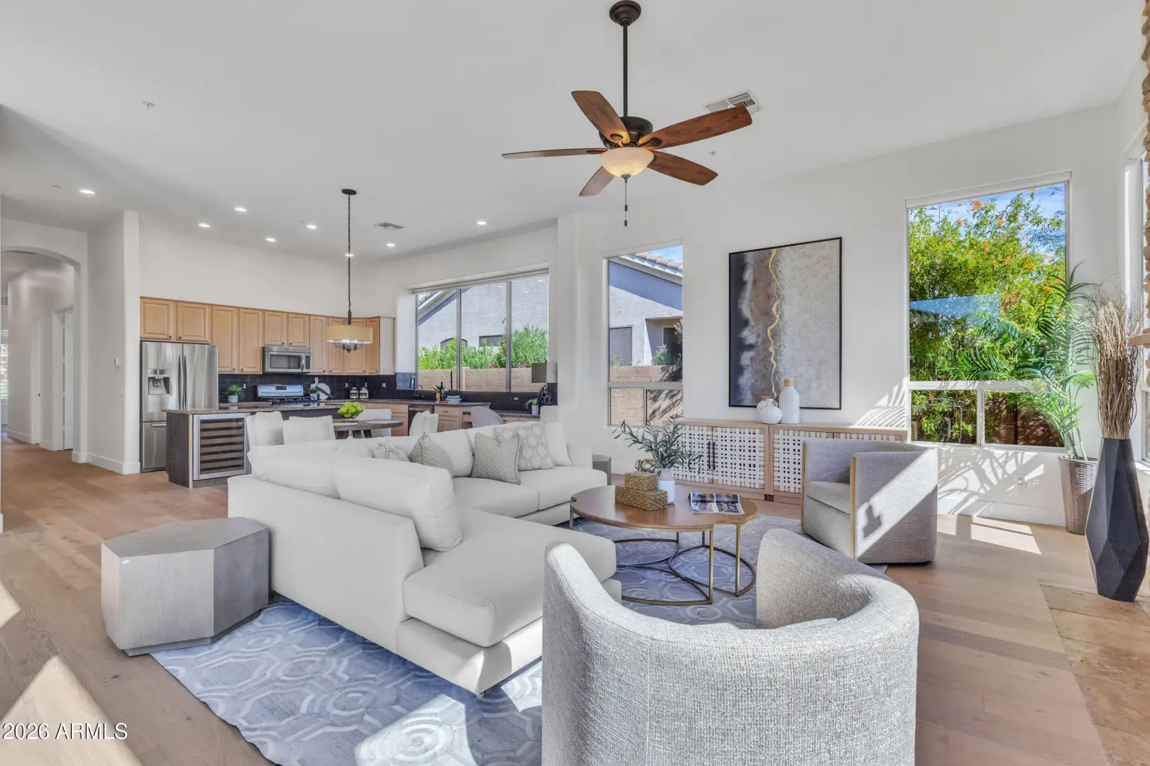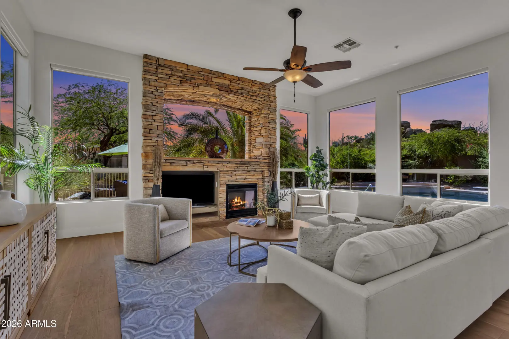Single-level split floorplan has no steps in or out, 3 full baths, and 3 car garage. Situated on a large lot backing to wash with Boulder Mountain VIEWS and Diving Pool. Brand new wide-plank wood flooring throughout and new carpet in secondary bedrooms. Freshly painted interior and new LED recessed lighting. Office has room for a closet for 4th bedroom. Fully inspected and all minor items have been professionally repaired or replaced incl. pool drained, new lighting, drain cover, aerator and fresh new water. Plus a LOW HOA and access to Troon and Pinnacle Peak hiking. COME SEE!