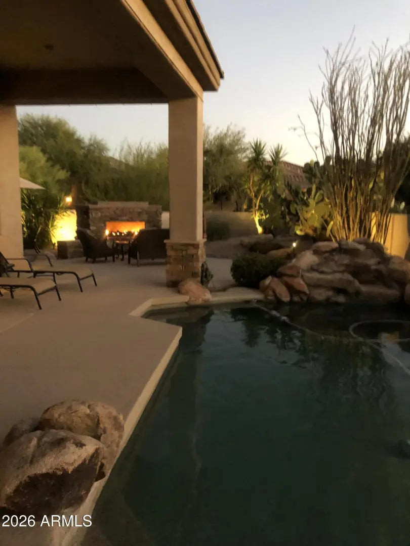 This stunning fully remodeled home sits on the 2nd fairway of the Legend Trail golf course and boasts beautiful golf course, Black Mountain, & sunset views. The entire home was meticulously redesigned with gorgeous high-end finishes including, wood look wide plank tile flooring, (no carpet!), split faced stone fireplace and art niches, designer bathroom & kitchen finishes. The open concept floorplan showcases a chef's kitchen with stainless appliances including gas cooktop w/ hood, island w/ample storage, wine fridge, breakfast area, & walk-in pantry. The large master has separate patio access, a barn door entrance to ensuite with 2 walk-in closets, shower, tub, dual sinks and cosmetic sitting area. Both Guest bedrooms are split from master, one has double door entrance with a large