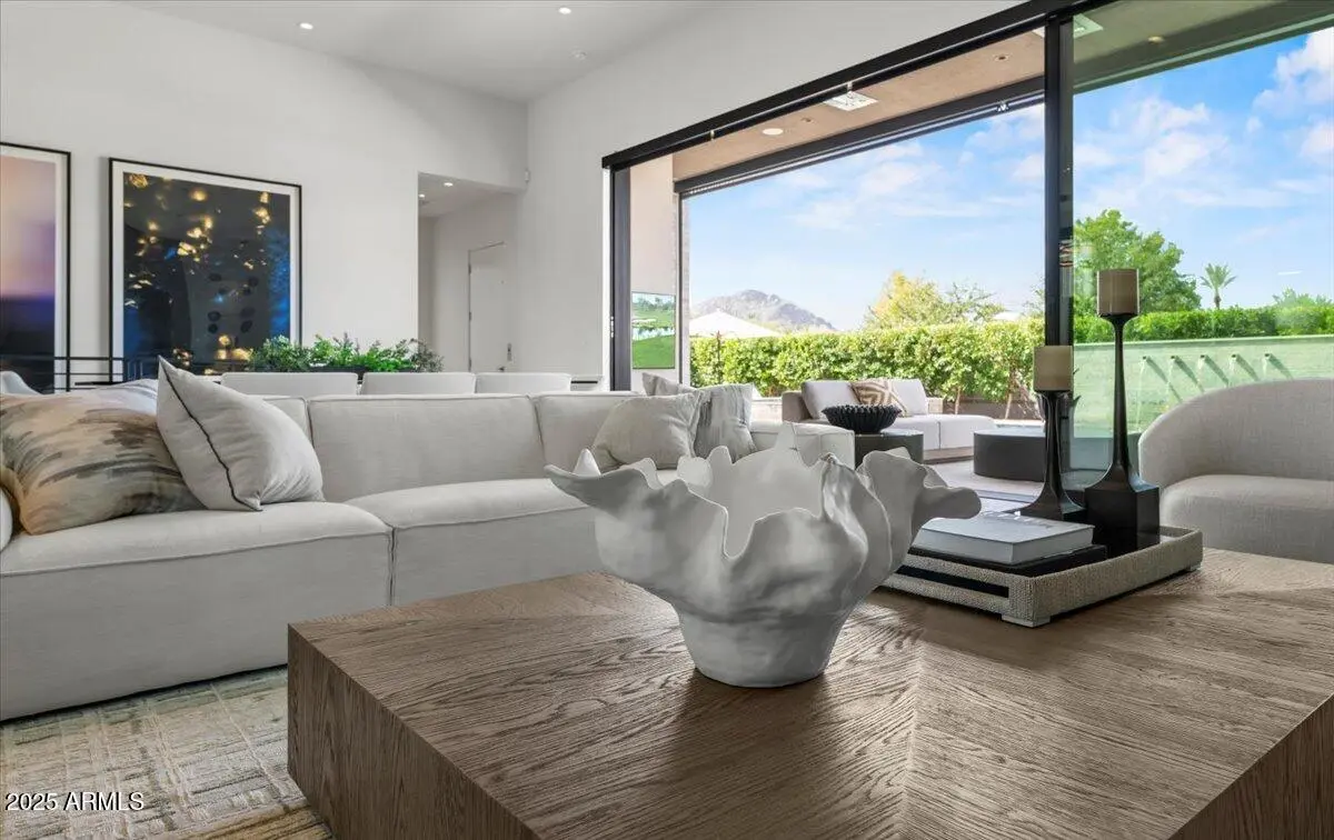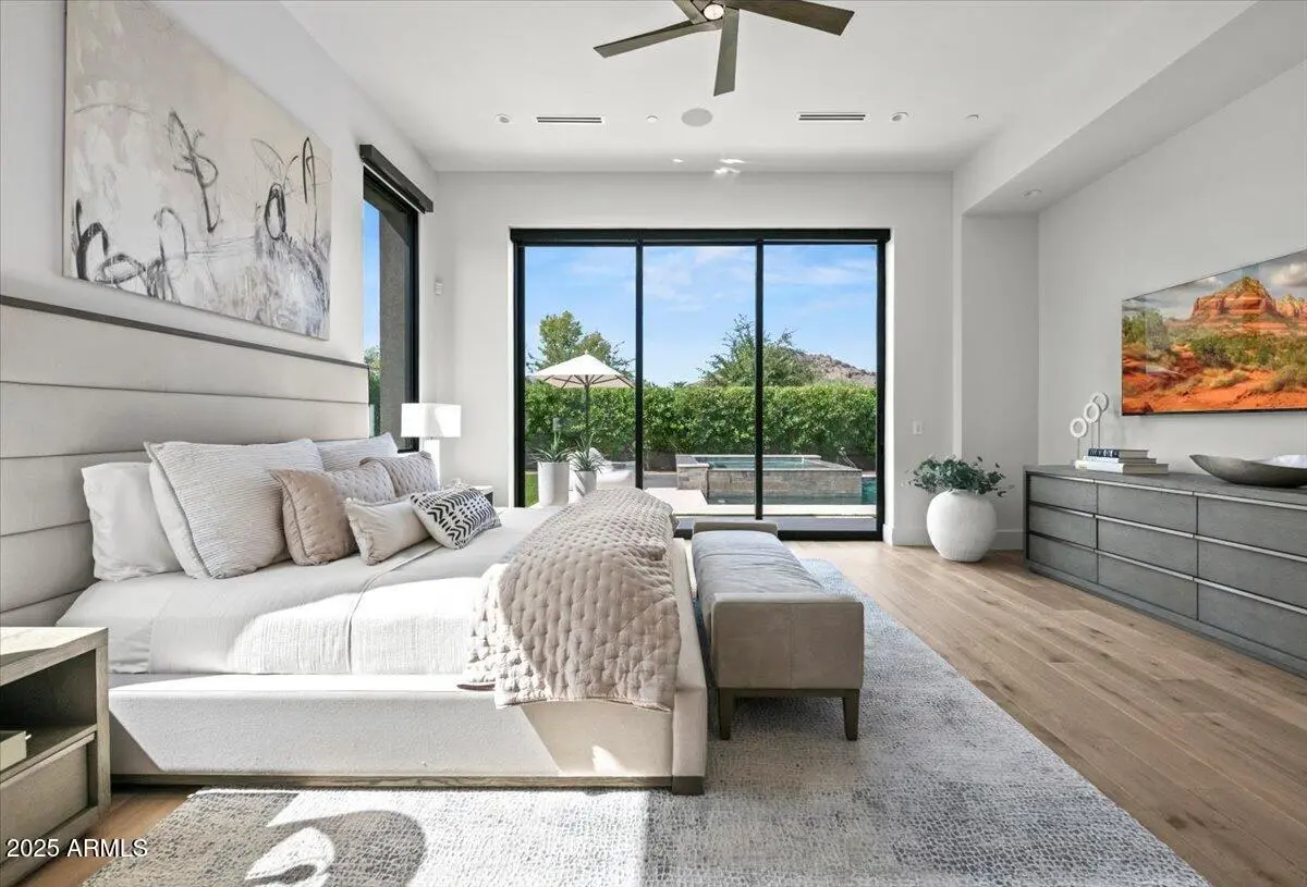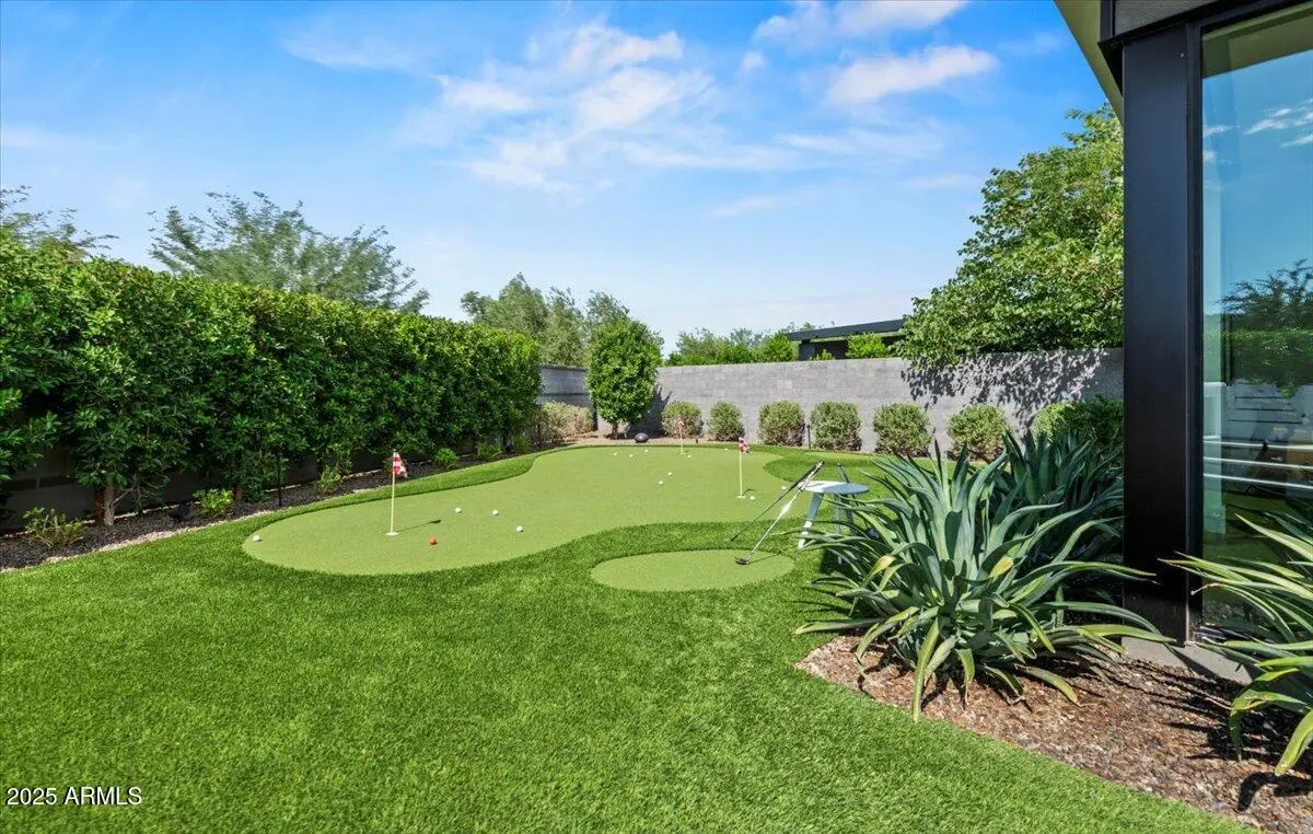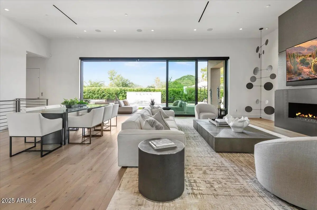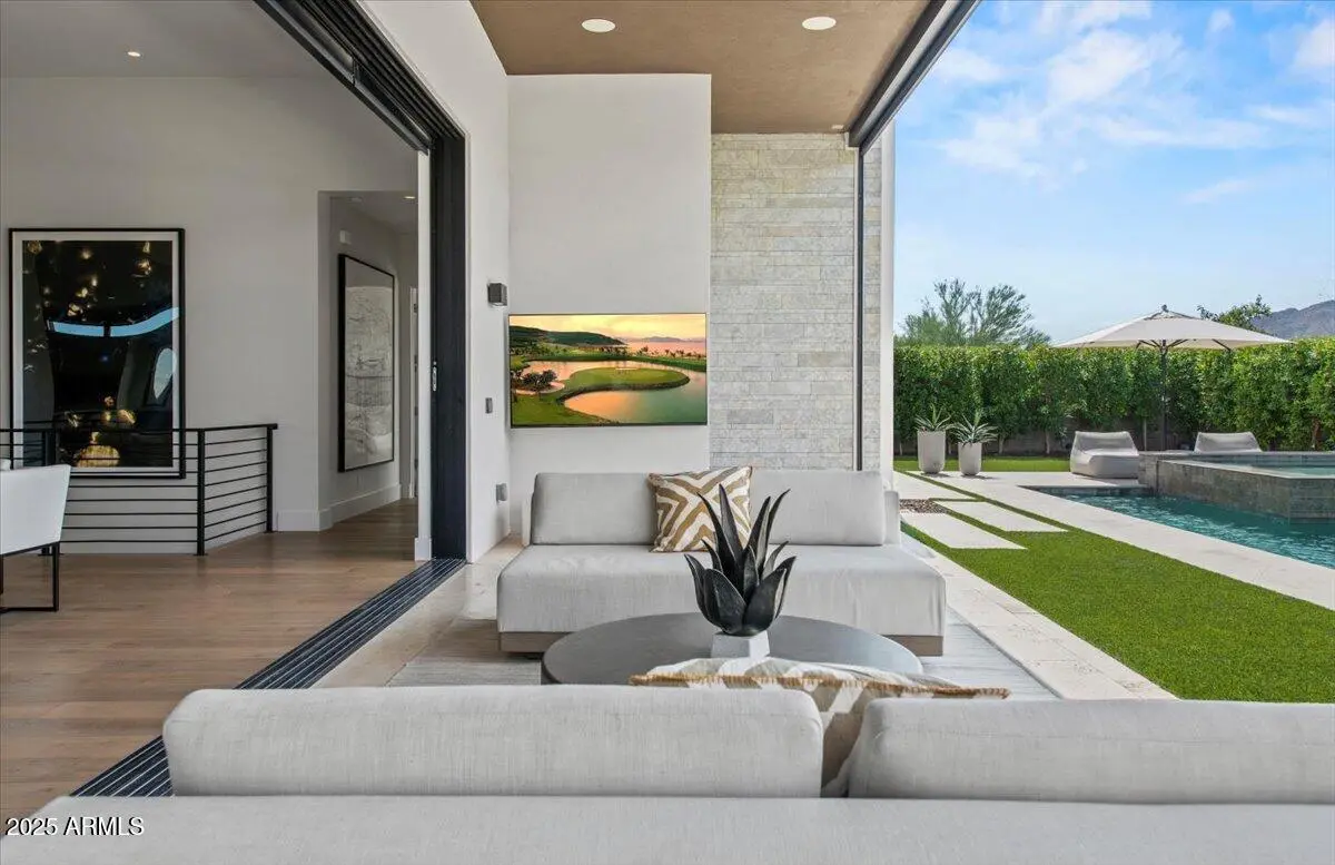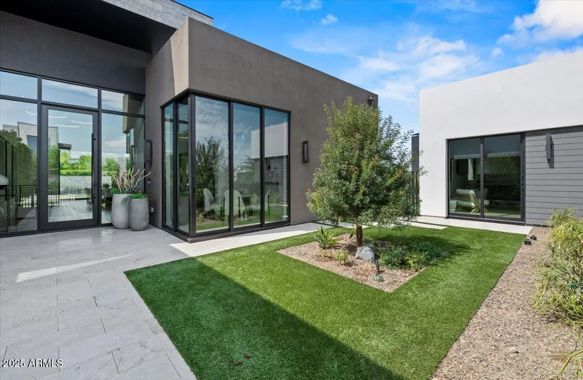 Stunning modern home in gated Azure, Paradise Valley. Ideally positioned on a premium homesite with lovely views of Camelback and Mummy Mountains. Designed for entertaining and comfort, this residence offers seamless indoor-outdoor living with a spacious yard, a covered patio with remote shade and patio heaters, two beautiful casitas, a pergola, putting green, and open play space. Inside, a modern gourmet kitchen features Gaggenau and Thermadore appliances, custom cabinetry, a prep area and a breakfast nook. Additional features include an elevator, custom closets throughout, advanced smart-home technology system that controls music, blinds, and security, a water purification system. This property is a true blend of luxury, comfort, location, and design in one of PV's premier communities.