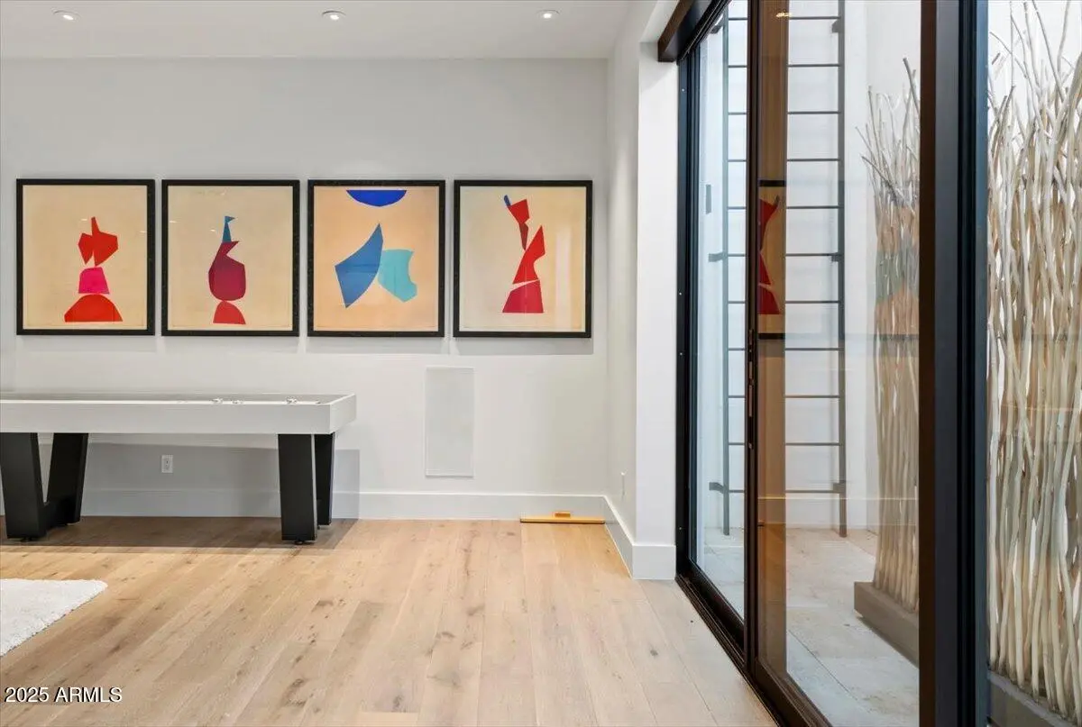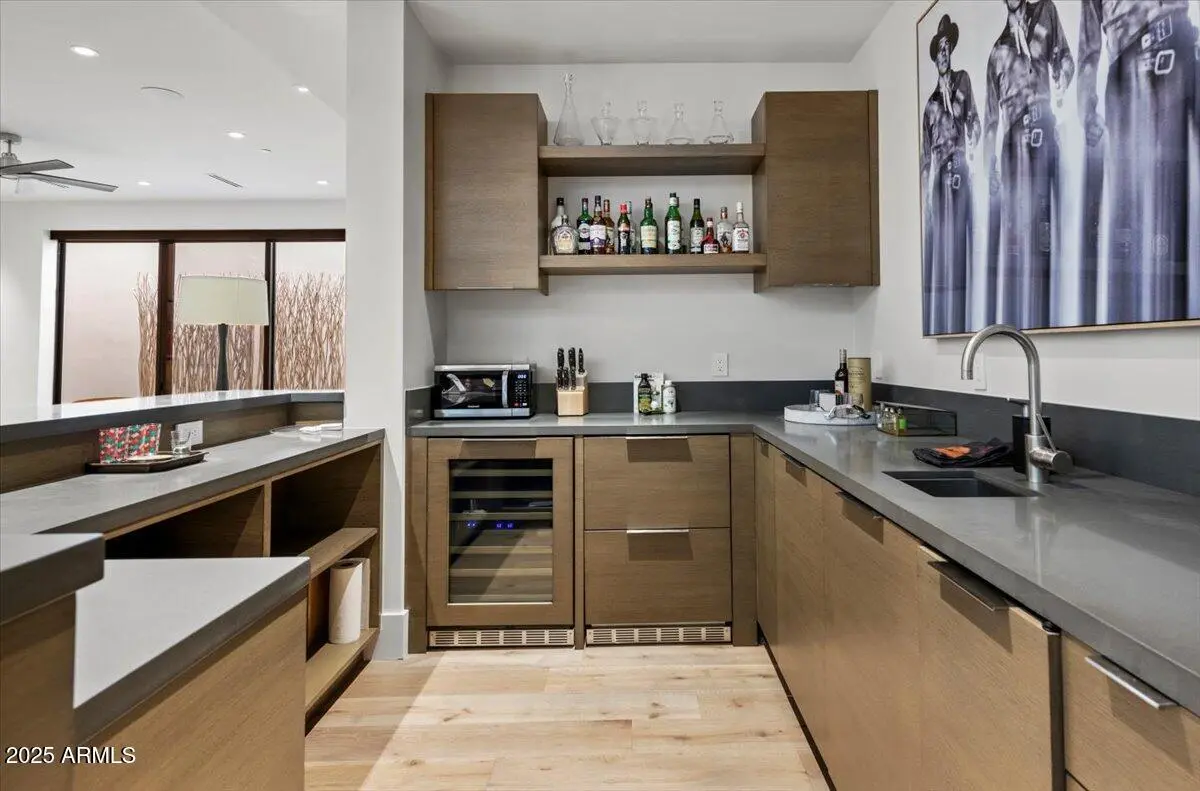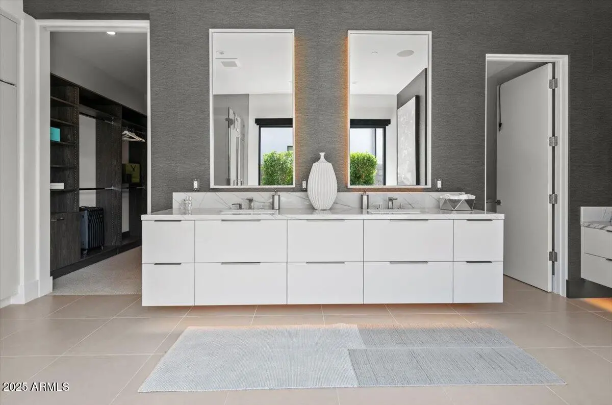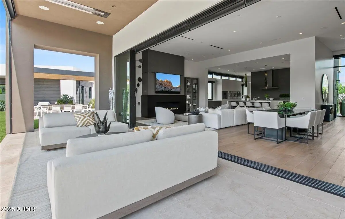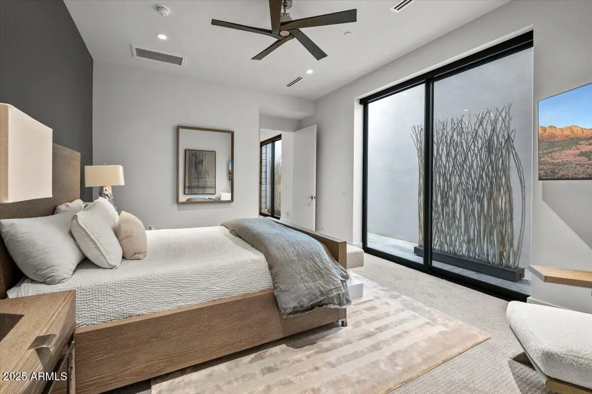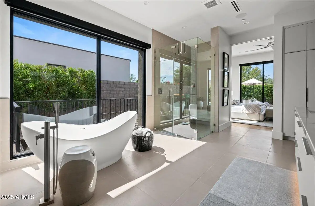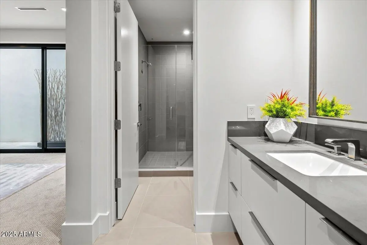 Stunning modern home in gated Azure, Paradise Valley. Ideally positioned on a premium homesite with lovely views of Camelback and Mummy Mountains. Designed for entertaining and comfort, this residence offers seamless indoor-outdoor living with a spacious yard, a covered patio with remote shade and patio heaters, two beautiful casitas, a pergola, putting green, and open play space. Inside, a modern gourmet kitchen features Gaggenau and Thermadore appliances, custom cabinetry, a prep area and a breakfast nook. Additional features include an elevator, custom closets throughout, advanced smart-home technology system that controls music, blinds, and security, a water purification system. This property is a true blend of luxury, comfort, location, and design in one of PV's premier communities.