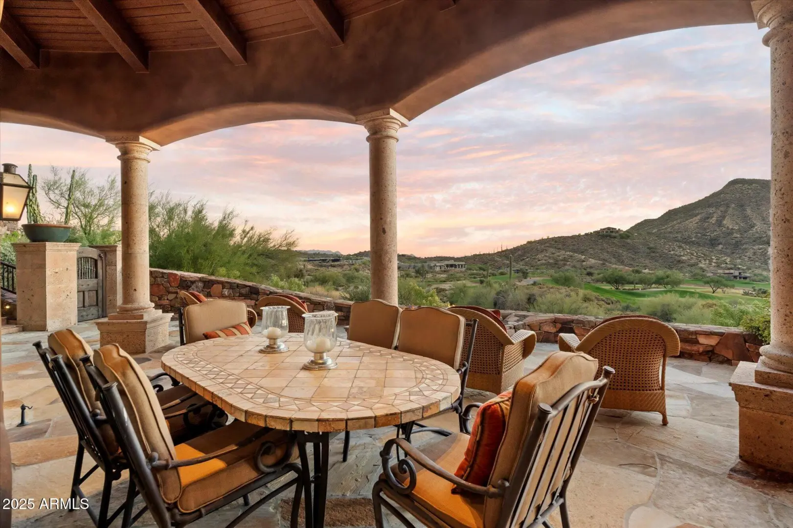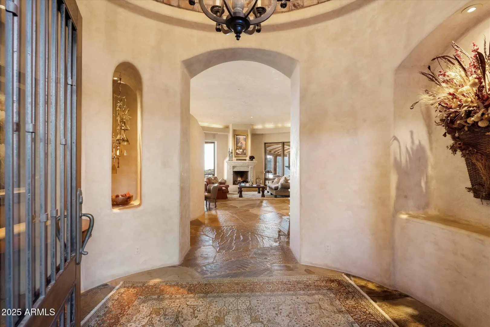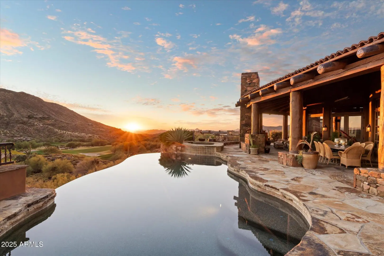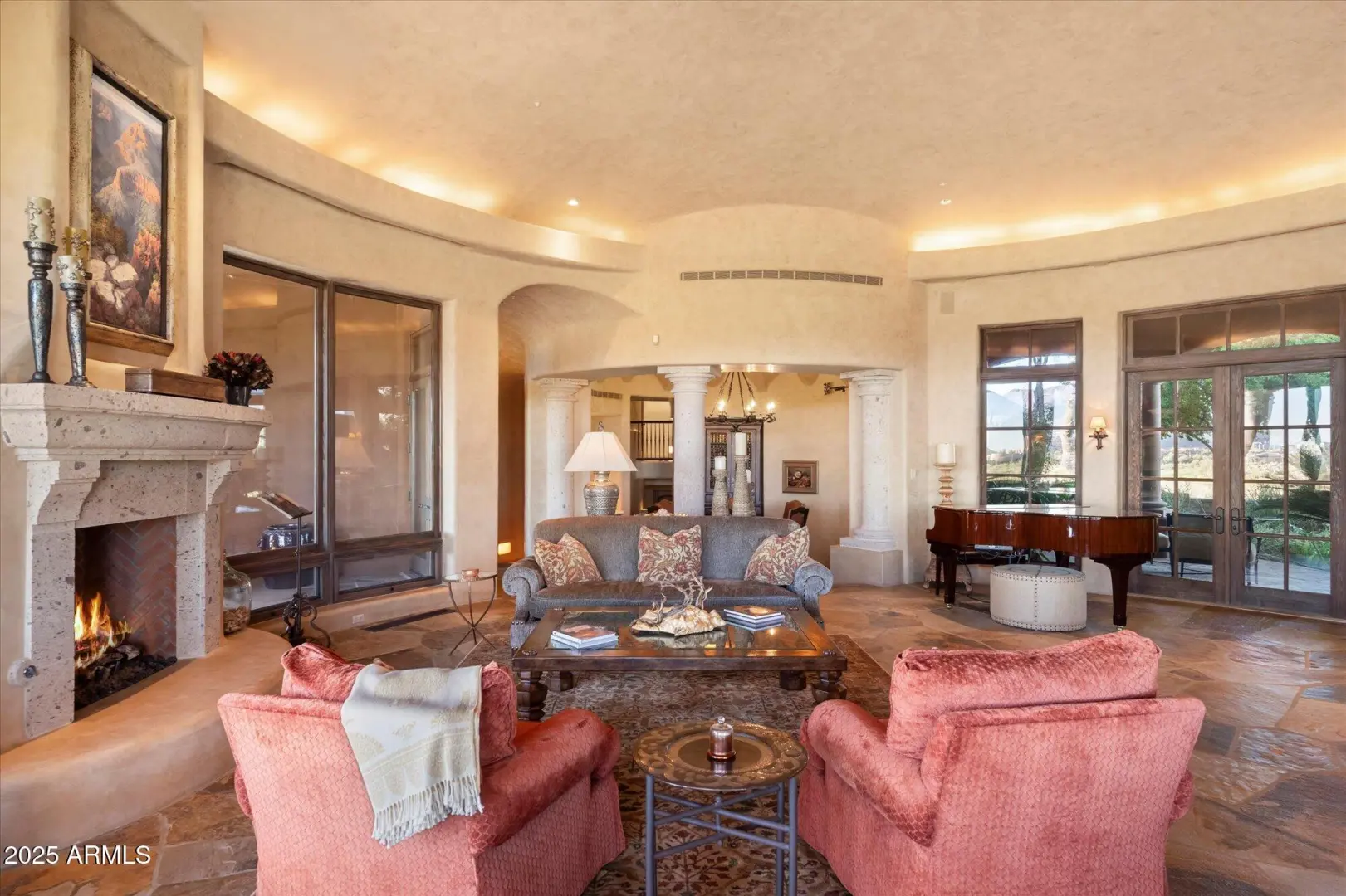 With Available Golf Membership: Experience luxurious desert living in this stunning Southwestern architectural masterpiece by renowned designer Lee Hutchinson. This exceptional estate features a flowing, organic Pueblo design that harmonizes seamlessly with the natural desert landscape. Encompassing an impressive 9,085 sq. ft., the main residence, built by Shiloh Homes, offers five spacious en-suite bedrooms. A hallmark of southwestern elegance, the home boasts six fireplaces, creating warm, inviting spaces throughout. Multiple living areas, expansive covered patios (totaling 4,000 sq. ft.), and sweeping views provide a blend of comfort and grandeur. Built in 2013 by Arnet, the guest house spans 2,540 sq. ft. and offers two en-suite bedrooms, a full kitchen, a spacious great room,