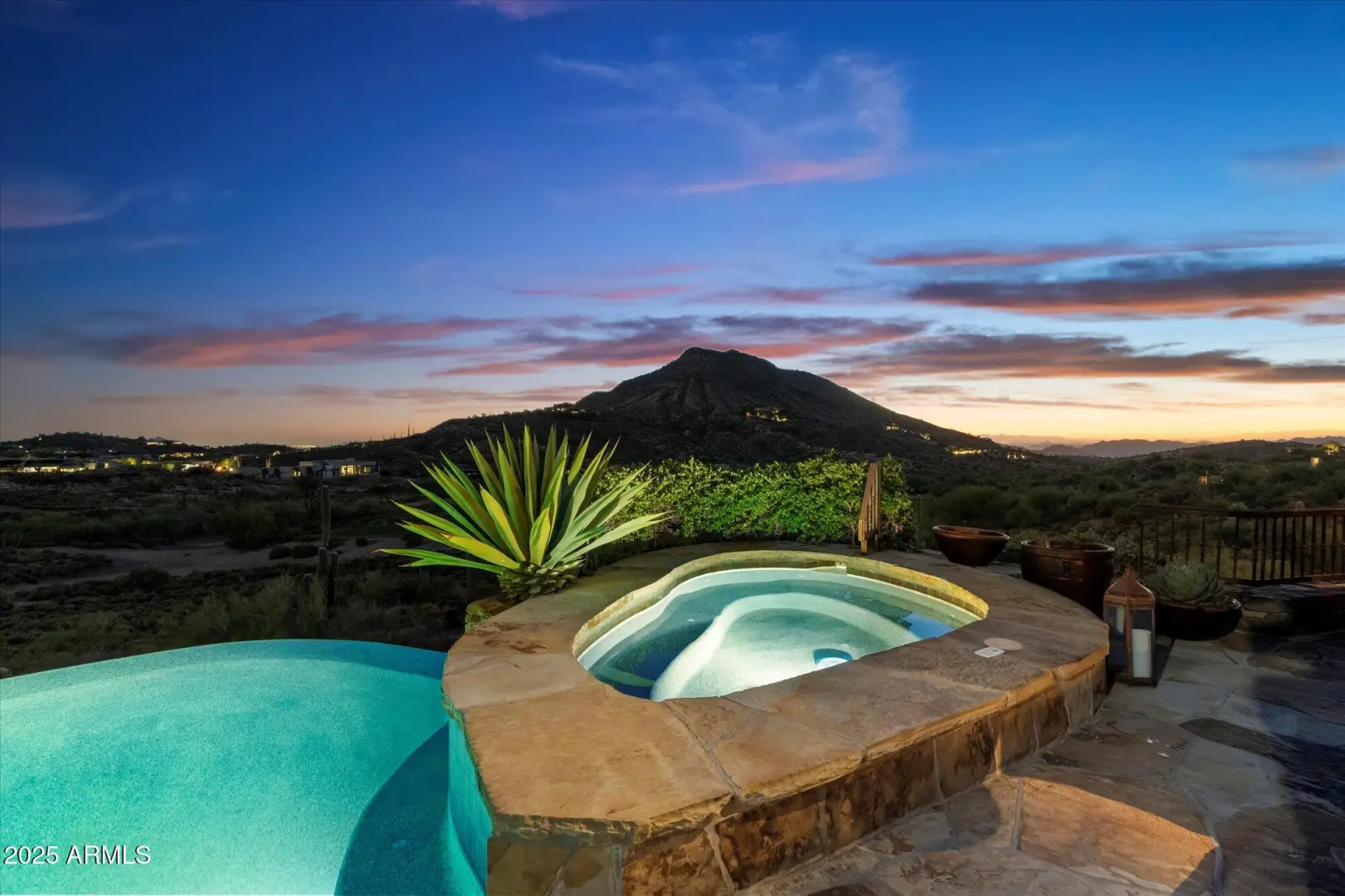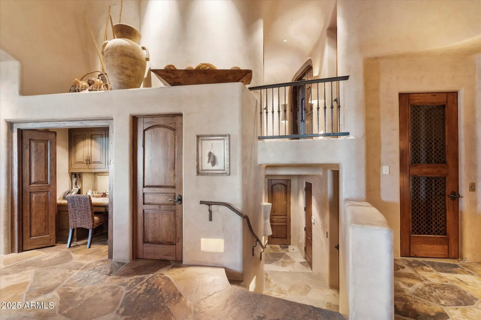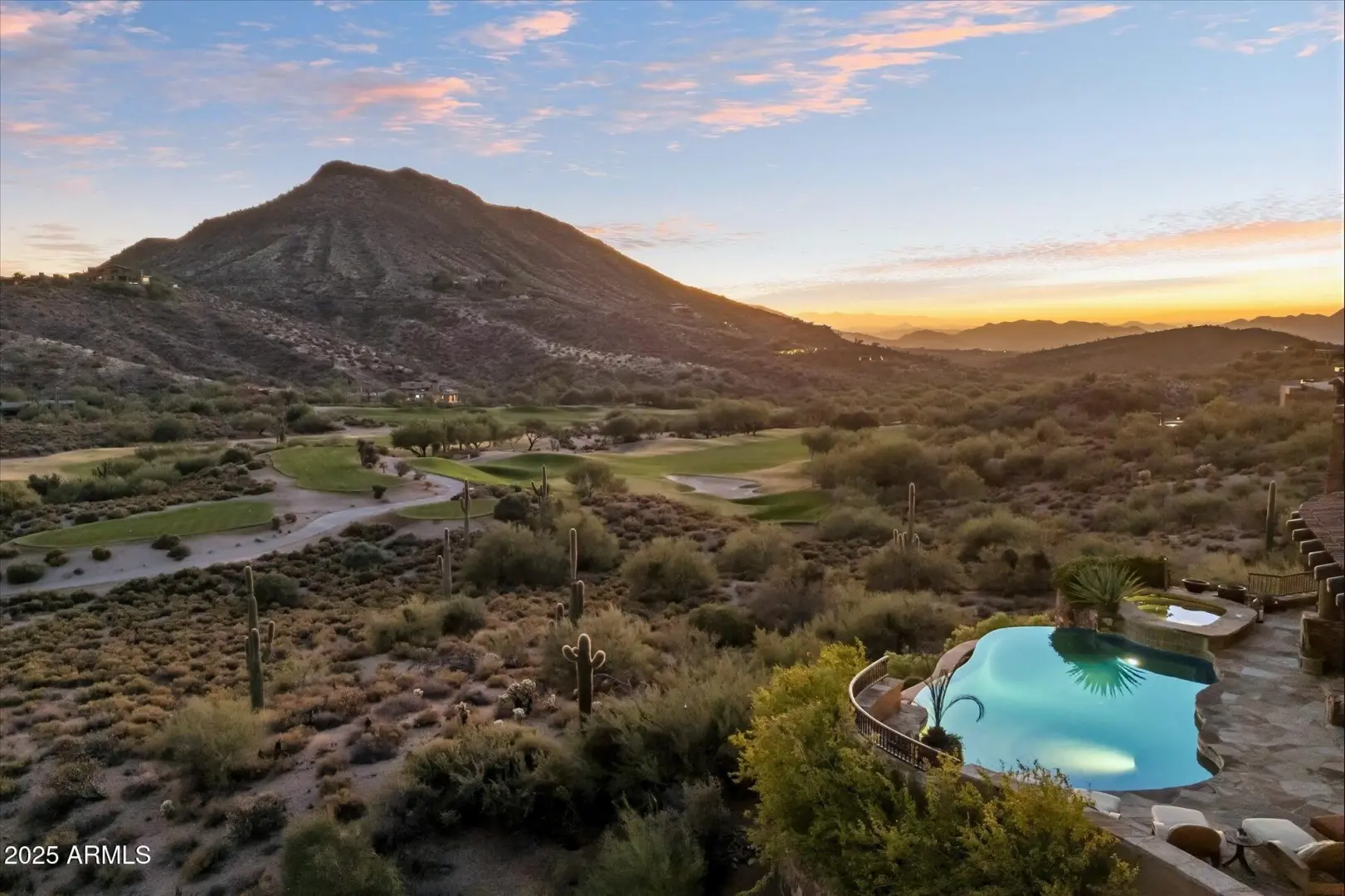With Available Golf Membership: Experience luxurious desert living in this stunning Southwestern architectural masterpiece by renowned designer Lee Hutchinson. This exceptional estate features a flowing, organic Pueblo design that harmonizes seamlessly with the natural desert landscape. Encompassing an impressive 9,085 sq. ft., the main residence, built by Shiloh Homes, offers five spacious en-suite bedrooms. A hallmark of southwestern elegance, the home boasts six fireplaces, creating warm, inviting spaces throughout. Multiple living areas, expansive covered patios (totaling 4,000 sq. ft.), and sweeping views provide a blend of comfort and grandeur. Built in 2013 by Arnet, the guest house spans 2,540 sq. ft. and offers two en-suite bedrooms, a full kitchen, a spacious great room,