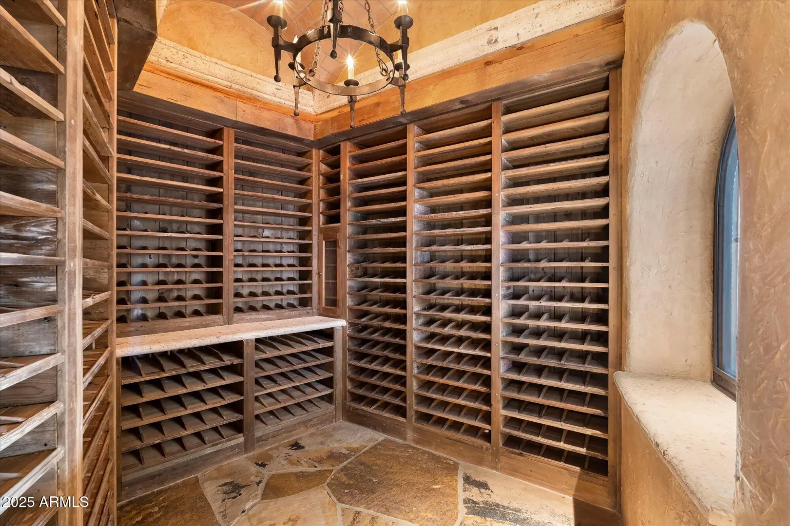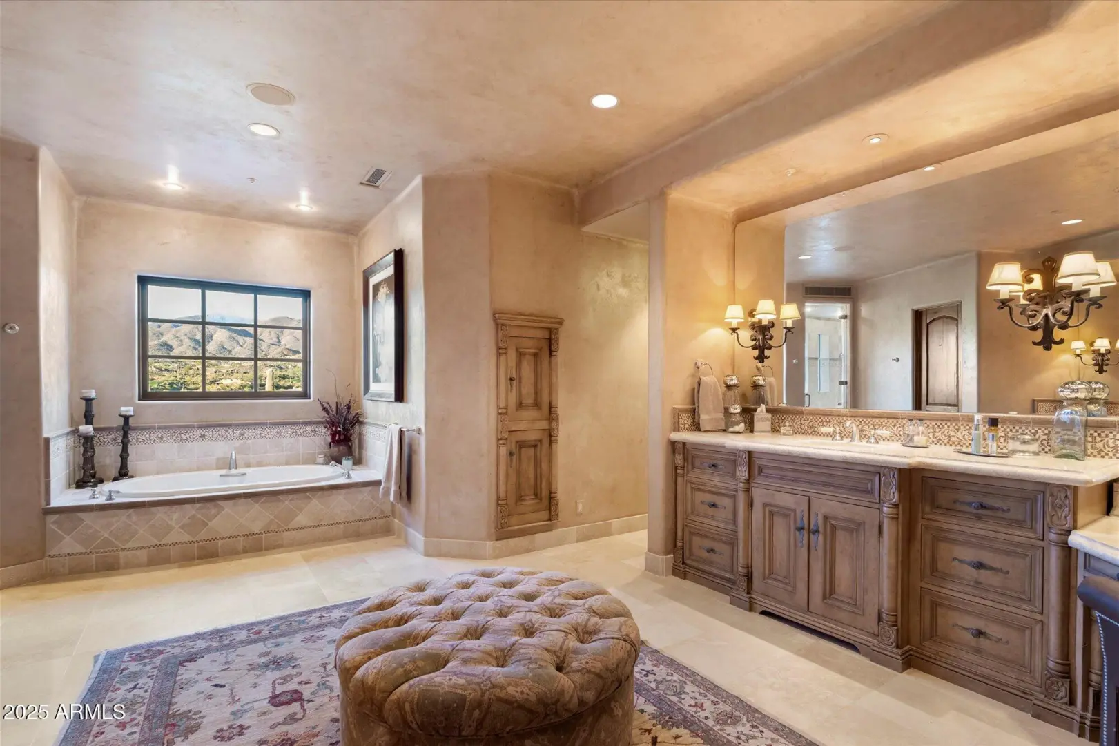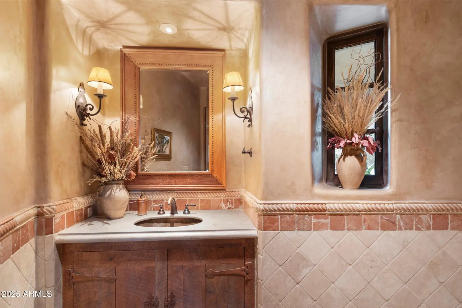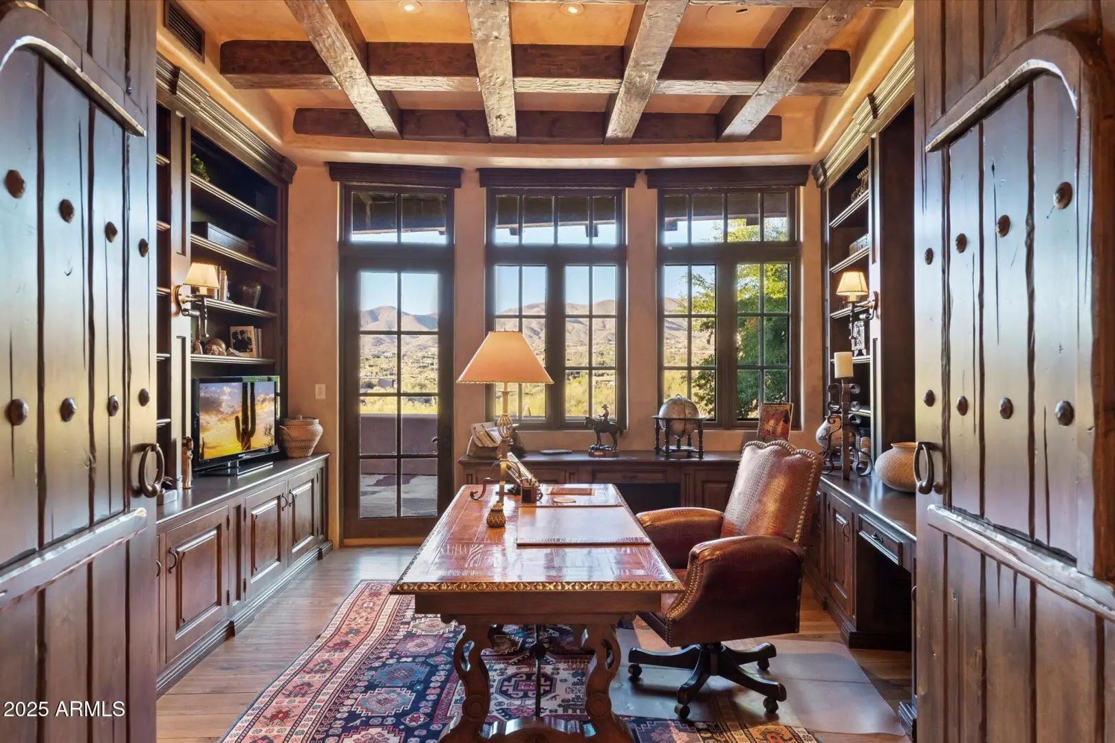 With Available Golf Membership: Experience luxurious desert living in this stunning Southwestern architectural masterpiece by renowned designer Lee Hutchinson. This exceptional estate features a flowing, organic Pueblo design that harmonizes seamlessly with the natural desert landscape. Encompassing an impressive 9,085 sq. ft., the main residence, built by Shiloh Homes, offers five spacious en-suite bedrooms. A hallmark of southwestern elegance, the home boasts six fireplaces, creating warm, inviting spaces throughout. Multiple living areas, expansive covered patios (totaling 4,000 sq. ft.), and sweeping views provide a blend of comfort and grandeur. Built in 2013 by Arnet, the guest house spans 2,540 sq. ft. and offers two en-suite bedrooms, a full kitchen, a spacious great room,